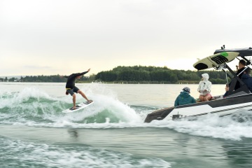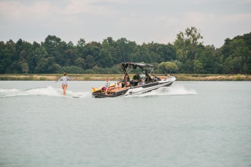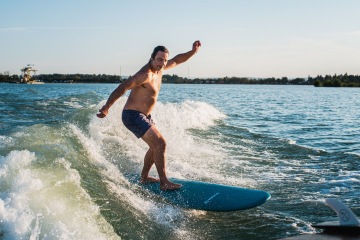 Wakesurfing is riding a surfboard on a wave behind a special boat. We ride behind a Malibu M220 boat that makes a beautiful wave. We surf daily from 8:00 am to 8:00 pm. The boat can accommodate up to 15 people, offering a unique experience not only for individuals, but also for groups of friends or corporate meetings.